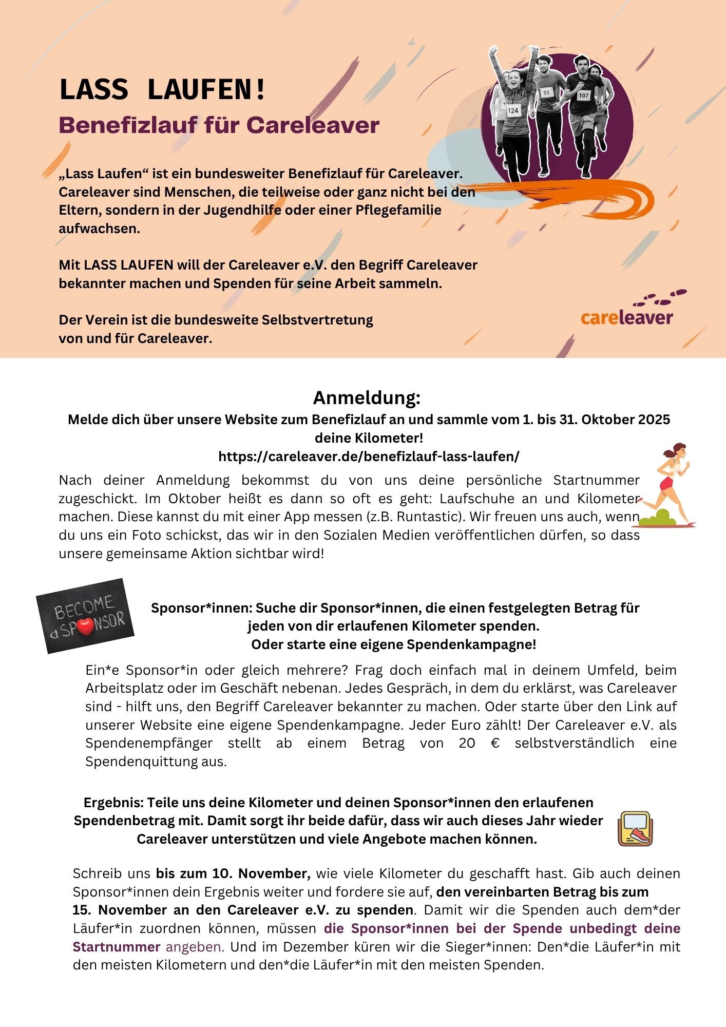 Unter dem Motto „Lass Laufen“ sammeln Careleaver und alle, die unsere Vereinsarbeit unterstützen wollen, vom 01. bis 31. Oktober ihre Kilometer. Sponsor*innen unterstützen sie dafür mit einem fest vereinbarten Betrag oder abhängig von der erreichten Kilometerzahl.