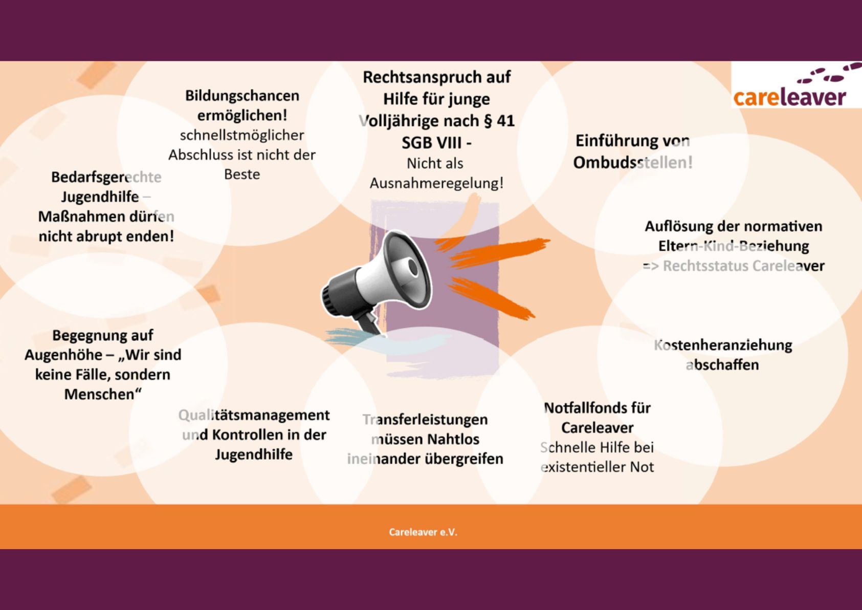 Meistens ging es dabei darum, anhand der eigenen Lebensgeschichte auf Missstände aufmerksam zu machen, die auch heute noch beim Übergang aus der Jugendhilfe in ein eigenständiges Erwachsenenleben bestehen. Außerdem wurden die innerhalb unserer Community entwickelten Modelle, Ideen und Vorschläge für Verbesserungen eingebracht.