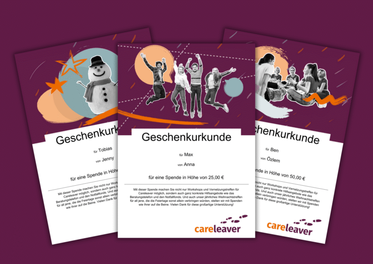 Geschenkspenden sind eine schöne und sinnvolle Möglichkeit, lieben Menschen eine Freude zu bereiten und gleichzeitig etwas Gutes zu tun. Unmittelbar nach Ihrer Spende lassen wir Ihnen eine schöne Urkunde zukommen, die Sie als Geschenk überreichen können und auf der beschrieben wird, was Ihre Zuwendung konkret bewirkt. Sie schenken also doppelt: Einem Menschen in Ihrem Umfeld das gute Gefühl, etwas zu bewirken – und den Careleavern, denen unsere Arbeit zugutekommt, echte Unterstützung!